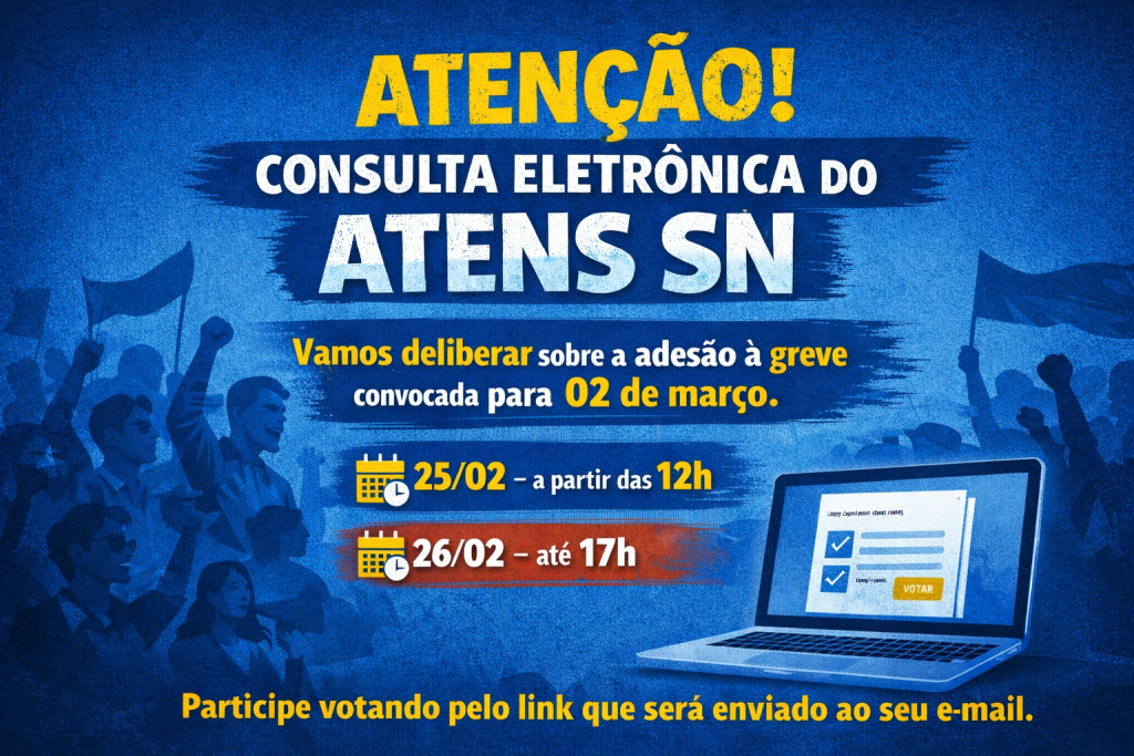 O ATENS Sindicato Nacional inicia nesta terça-feira, 25 de fevereiro, a partir das 12h, a Consulta Eletrônica junto aos seus filiados diretos para deliberar sobre a adesão à greve nacional […]