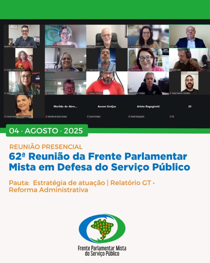 Em 4 de agosto de 2025, a Frente Parlamentar Mista em Defesa do Serviço Público realizou sua 62ª reunião ordinária, de forma virtual, reunindo representantes de diversas entidades sindicais e […]